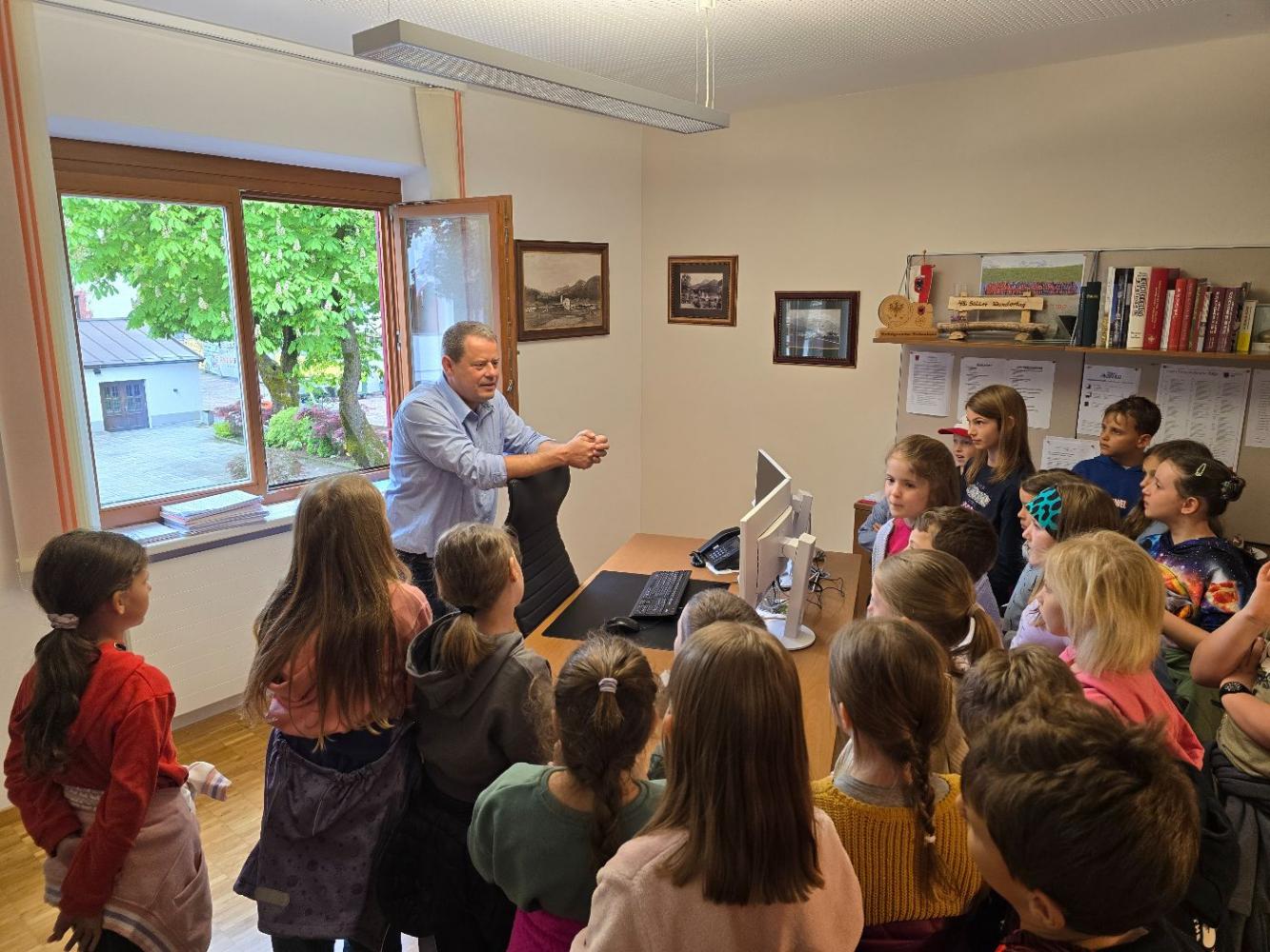 Herr Bürgermeister Ing. Wolfgang Knabl erklärte seine wichtigsten Aufgaben und im Anschluss daran hatten die Schülerinnen und Schüler die Gelegenheit, Fragen zu stellen. Die Kinder zeigten großes Interesse und stellten viele spannende Fragen rund um die Gemeinde, den Alltag im Amt und aktuelle Themen.