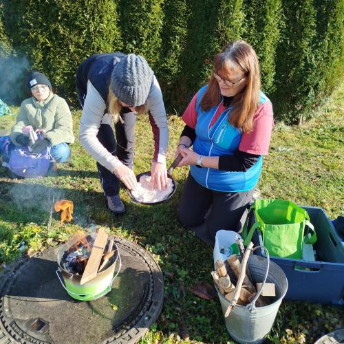 Zuerst erprobten die Kinder das Element Luft: Mit Naturmaterialien bauten sie einfache "Windmessgeräte". Anschließend wurde an einer sicheren Feuerstelle in der Wiese das Element Feuer praktisch erlebt. Über der Glut im Feuereimer wurde abschließend köstliches Pfannenbrot zubereitet.