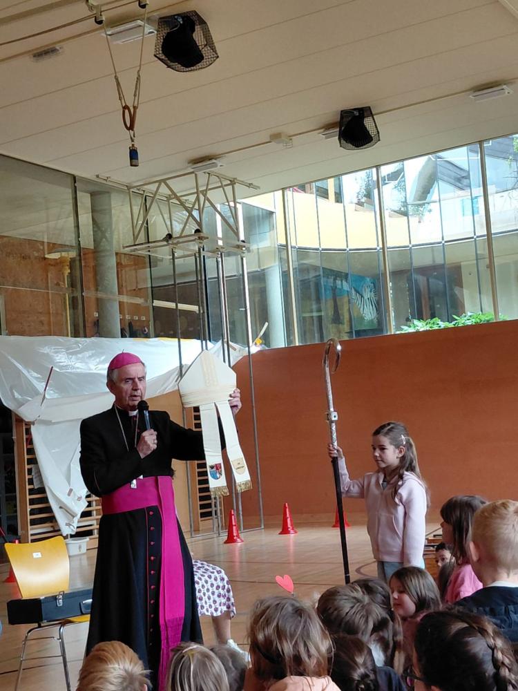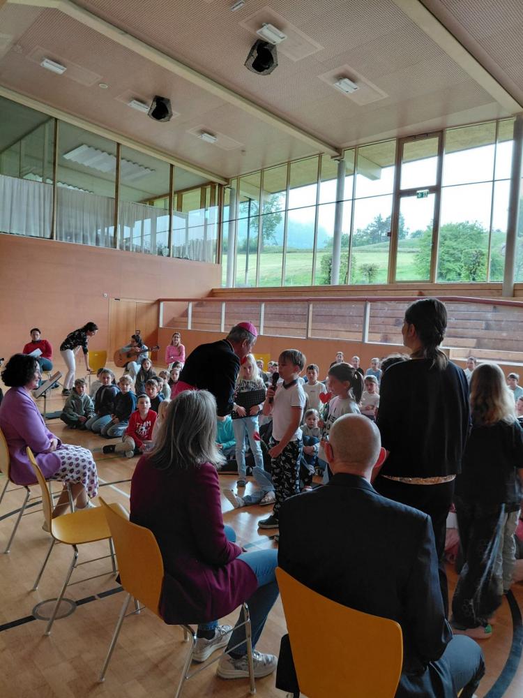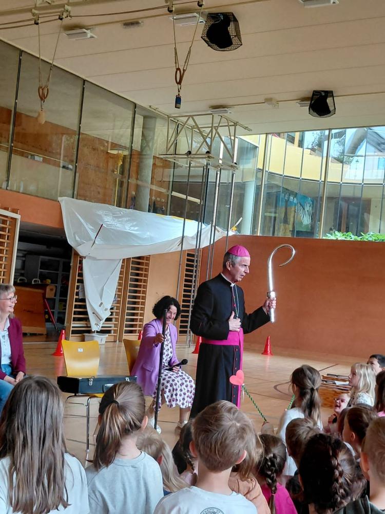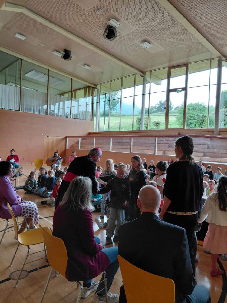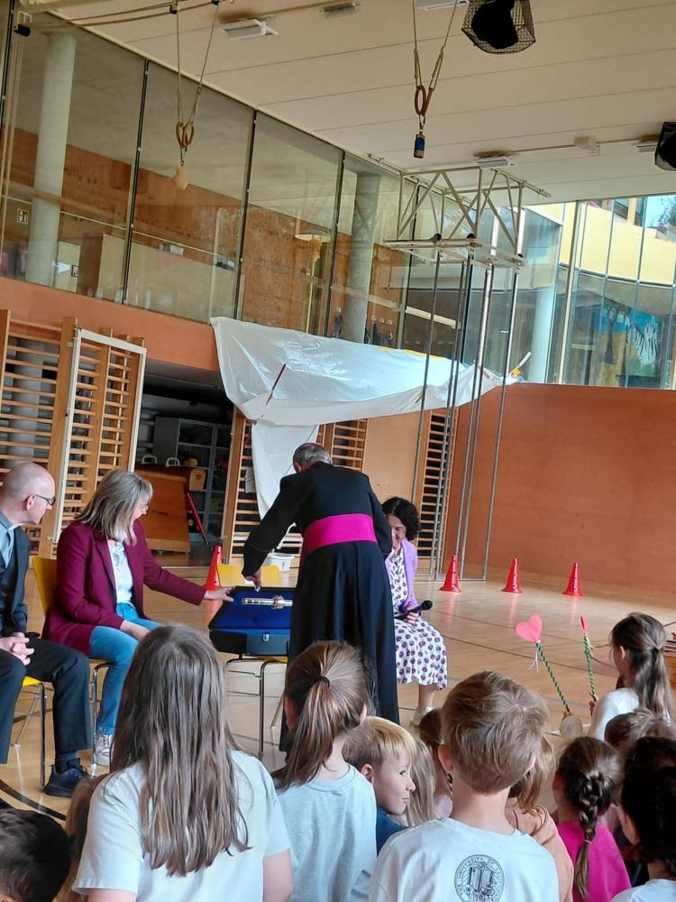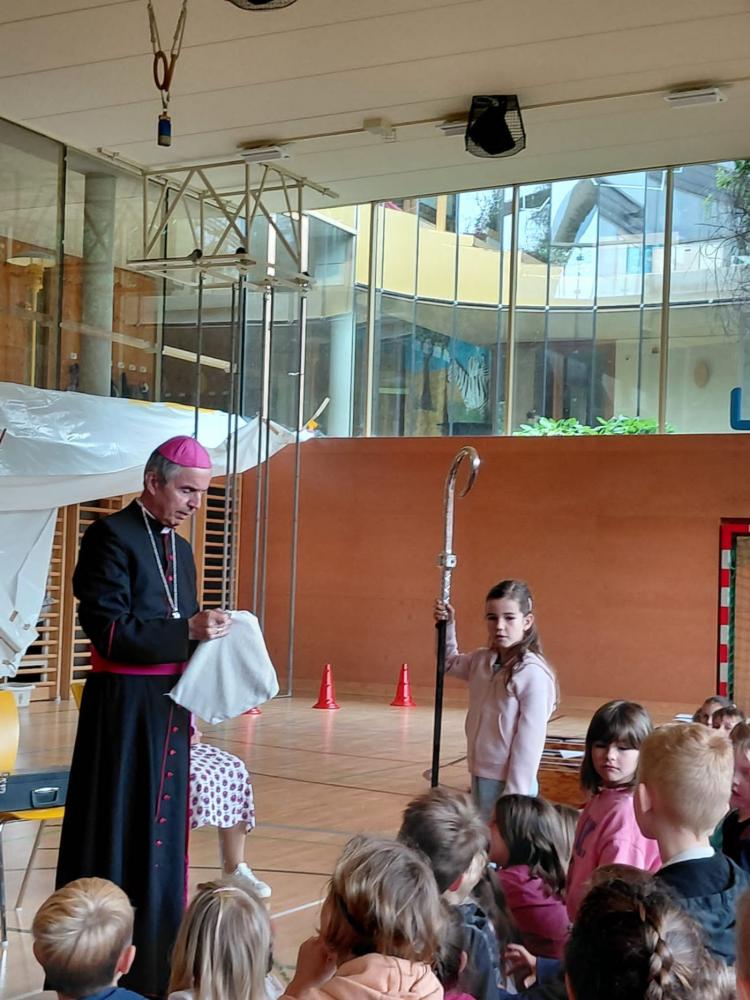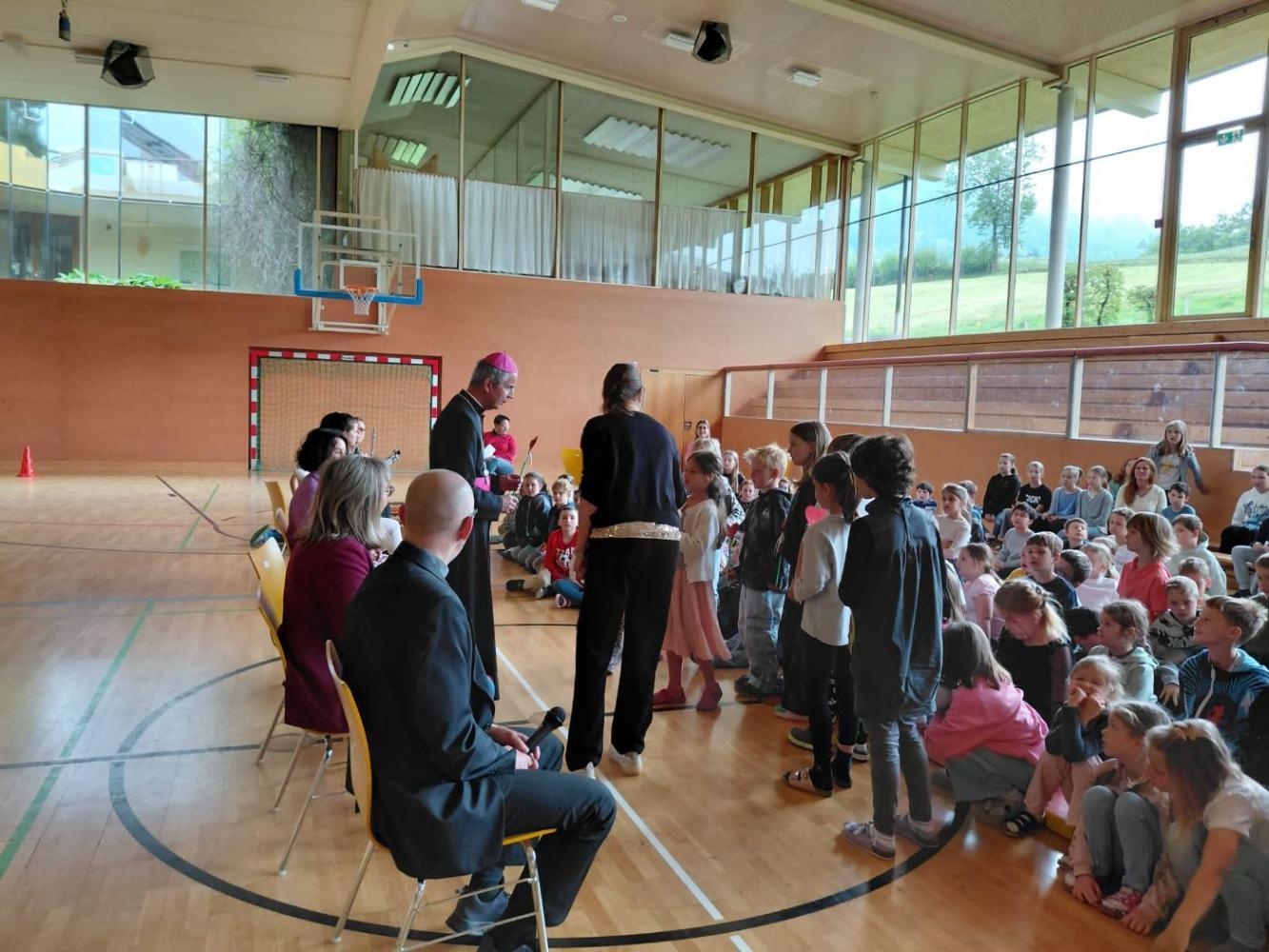 Am Freitag, den 09. Mai 2025 kam der Weihbischof Dr. Hansjörg Hofer im Rahmen der bischöflichen Visitation auch in der Volksschule vorbei. Alle versammelten sich im Turnsaal und erfreuten den Bischof mit einem abwechslungsreichen und musikalischen Programm. Es gab auch Gelegenheit dem Weihbischof einige Fragen zu stellen. Nicht nur sein Amt und sein Äußeres wurden hinterfragt, auch private Fragen wurden beantwortet. Nach einem Rundgang im Schulhaus und einem Besuch in der 4b Klasse verabschiedete sich der Weihbischof wieder und machte sich auf den Weg in die Volksschule Scheffau.