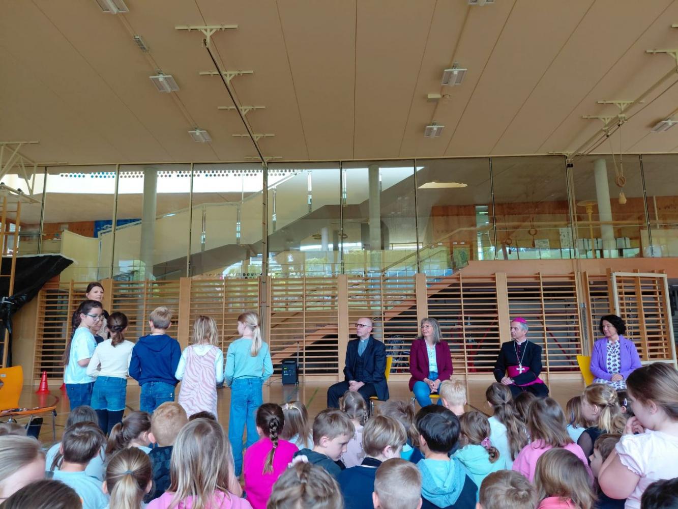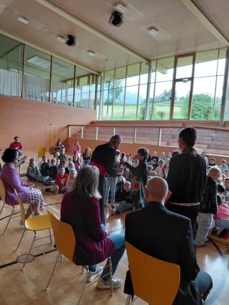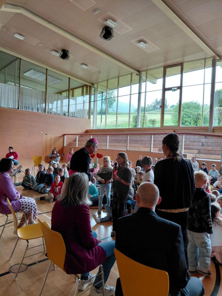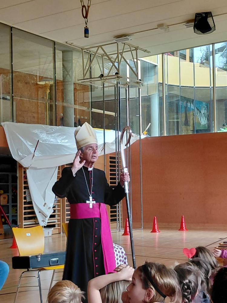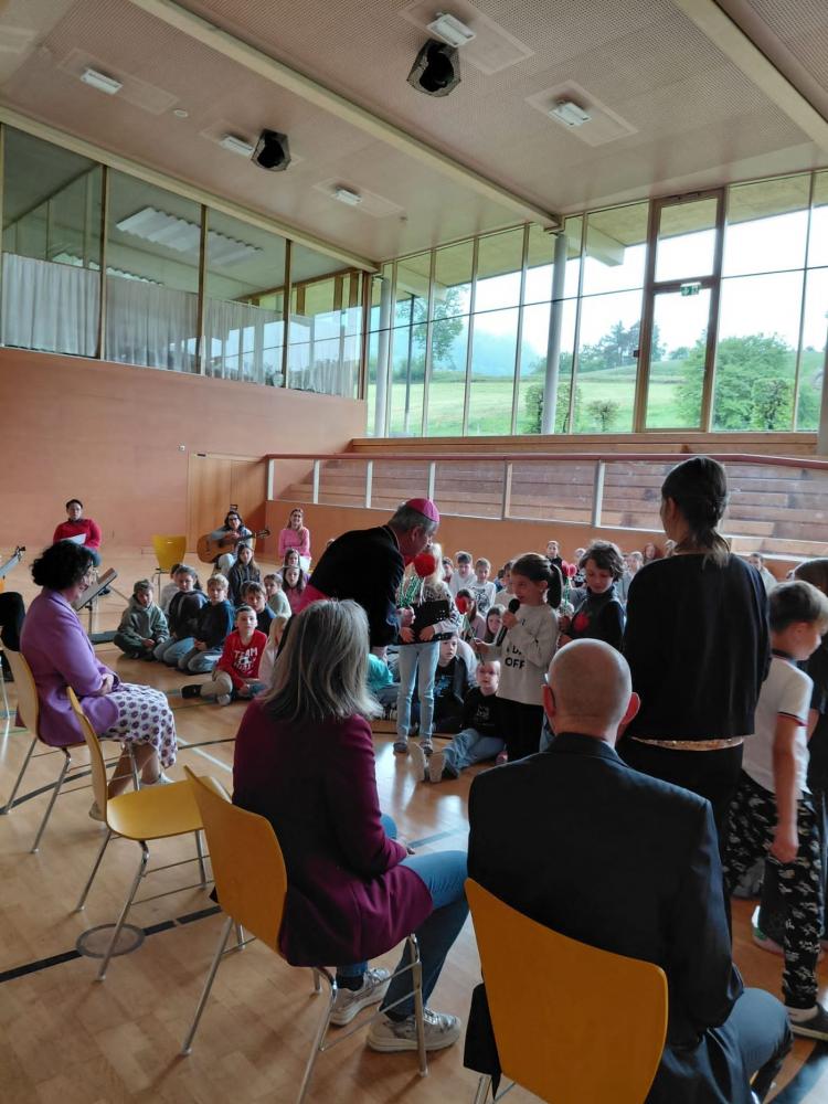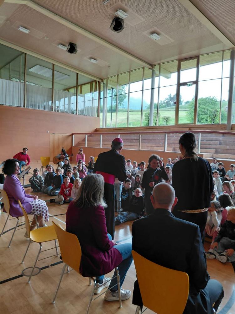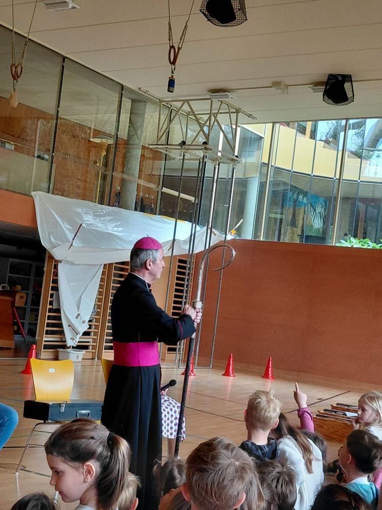 Am Freitag, den 09. Mai 2025 kam der Weihbischof Dr. Hansjörg Hofer im Rahmen der bischöflichen Visitation auch in der Volksschule vorbei. Alle versammelten sich im Turnsaal und erfreuten den Bischof mit einem abwechslungsreichen und musikalischen Programm. Es gab auch Gelegenheit dem Weihbischof einige Fragen zu stellen. Nicht nur sein Amt und sein Äußeres wurden hinterfragt, auch private Fragen wurden beantwortet. Nach einem Rundgang im Schulhaus und einem Besuch in der 4b Klasse verabschiedete sich der Weihbischof wieder und machte sich auf den Weg in die Volksschule Scheffau.